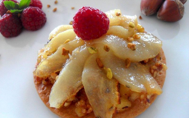 Etape 5: Dressez dessus les tranches de poires en éventail. Décorez avec quelques framboises et saupoudrez d’éclats de pistaches torréfiées.