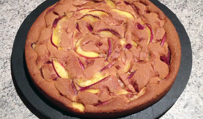 Répartissez les framboises en les enfonçant dans la pâte, puis coupez les nectarines en lamelles et répartissez les lamelles de la même façon dans les espaces restants.