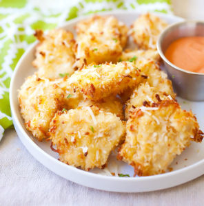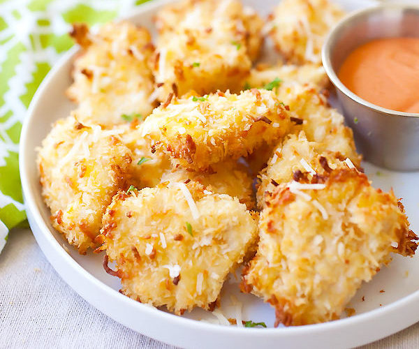 Trempez chaque morceau de poulet dans la farine, puis dans le mélange d’œufs et finalement dans la chapelure. Transférer à la plaque de cuisson.