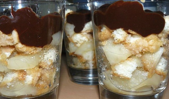 Remplir les coupes en procédant ainsi: une couche de poires, une couche de chocolat, une couche de biscuit, une couche de de poires, une couche de chocolat, une couche de biscuit, terminer par la chantilly au mascarpone et saupoudrer d’un voile de cacao non sucré.