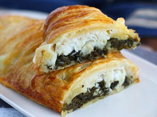 Déroulez la pâte feuilletée. Appliquez les épinards au centre, en donnant une forme ovale. Placez le dos de cabillaud sur les épinards.