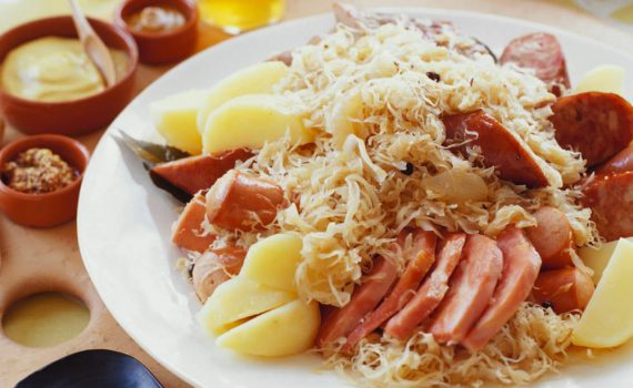 Liste d’ingrédients pour 4 personnes : 1.2 kg Choucroute crue 1 Oignons 150 gr Lard frais 150 gr Lard fumé 400 gr Collet salé (2 tranches de 200gr) 4 Saucisses de Montbéliard 4 Saucisses viennoises (knacks) 3 Feuilles de laurier 8 Baies de genièvre 3 Clous de girofle 2 […]